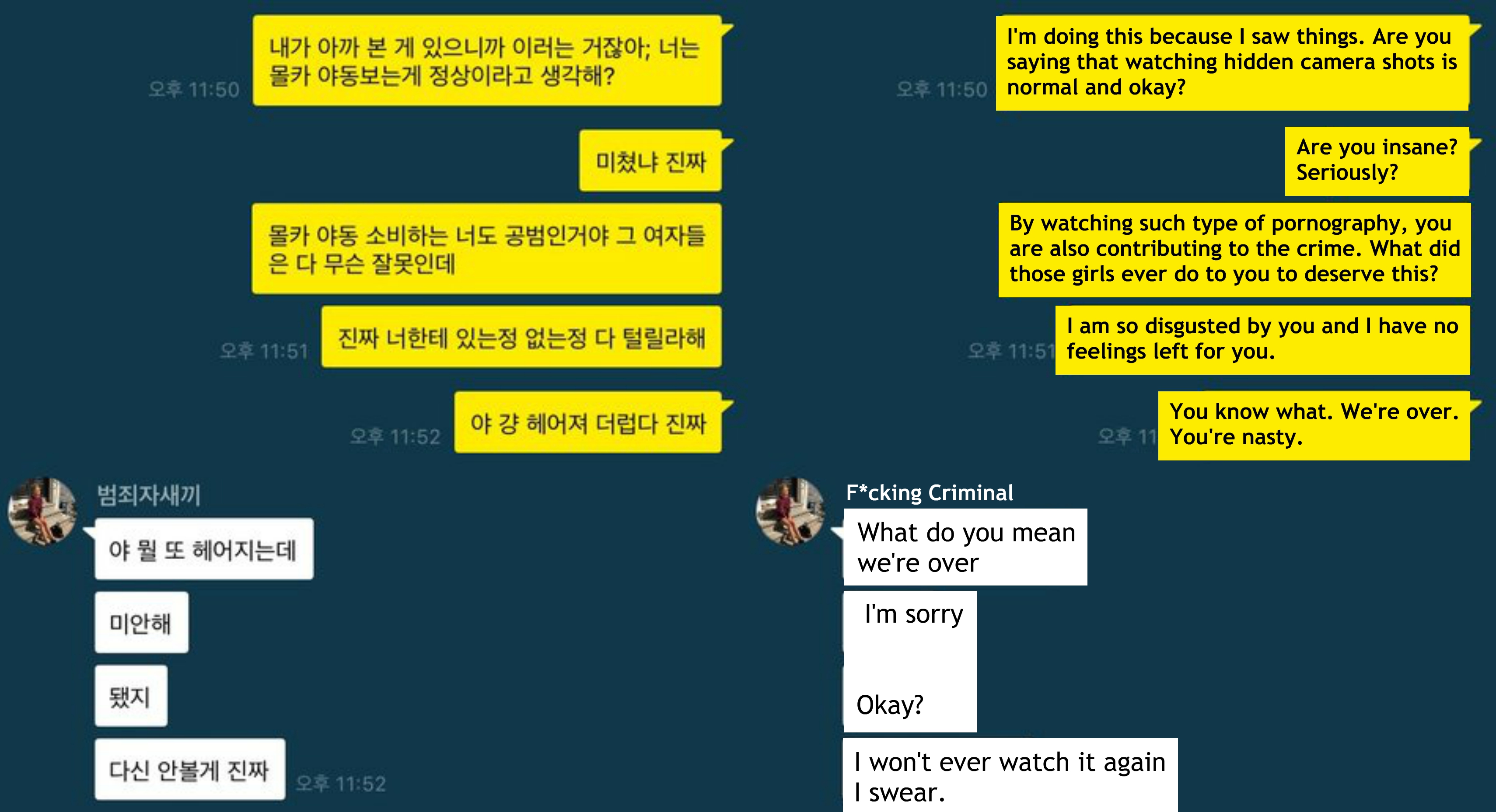 Van úgy az ember lánya, hogy belenéz a barátja telefonjába, főleg ha kell neki valami, esetünkben a koreai lány a párja telefonjába nézett bele pornóért, ám sokkal durvább dolgot fedezett fel benne. A felháborodott lány feltárta a valószínűleg most már ex-barátjának a telefonján lévő tartalmat képekkel. A barát egy szörnyű és különösen zavaró dolgot tett a mobiltelefonján s nézett az interneten, ami arra késztette a lányt, hogy minél hamarabb megszakítsa vele a kapcsolatot.